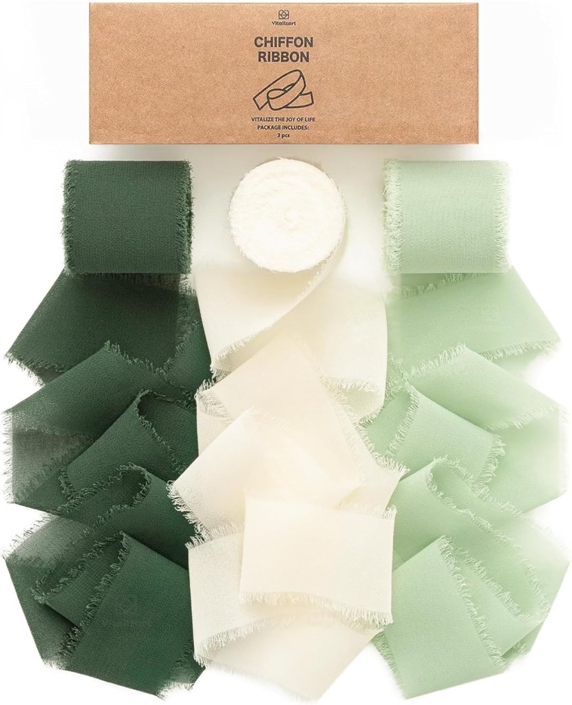 Vitalizart 3 Rolls Handmade Fringe Chiffon Silk Ribbon 1.5″ x 7Yd Cream & Green Ribbons Set for Wedding Invitations Bridal Bouquets Gifts Wrapping DIY Crafts