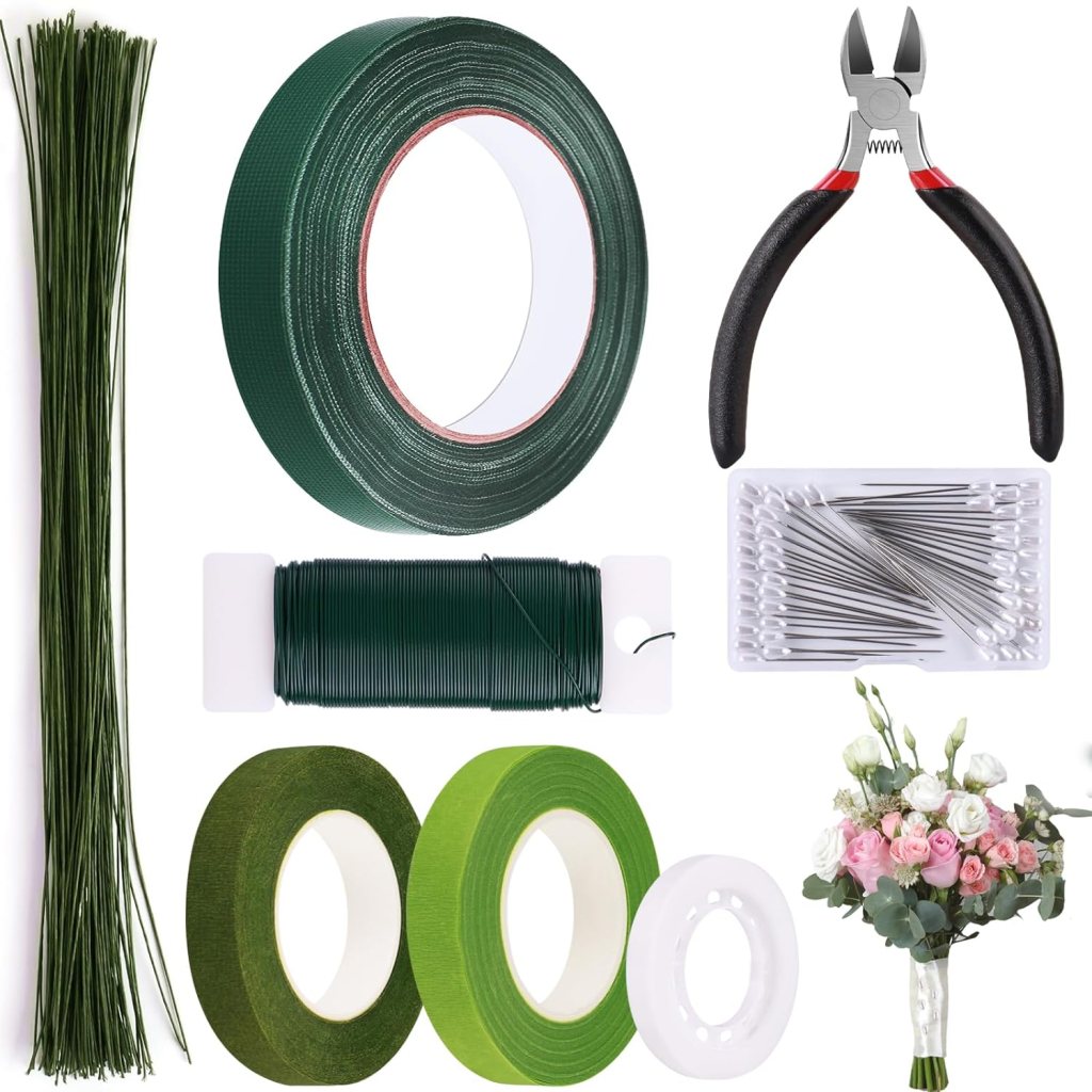 GLAMFIELDS Floral Arrangement Kit with Floral Tape, 26 Gauge Floral Stem Wire, 22 Gauge Floral Wire, Cutter, Boutonniere Flower pin for Bouquet Stem Wrapping, Floral Crafts and Wedding Bridal Bouquets
