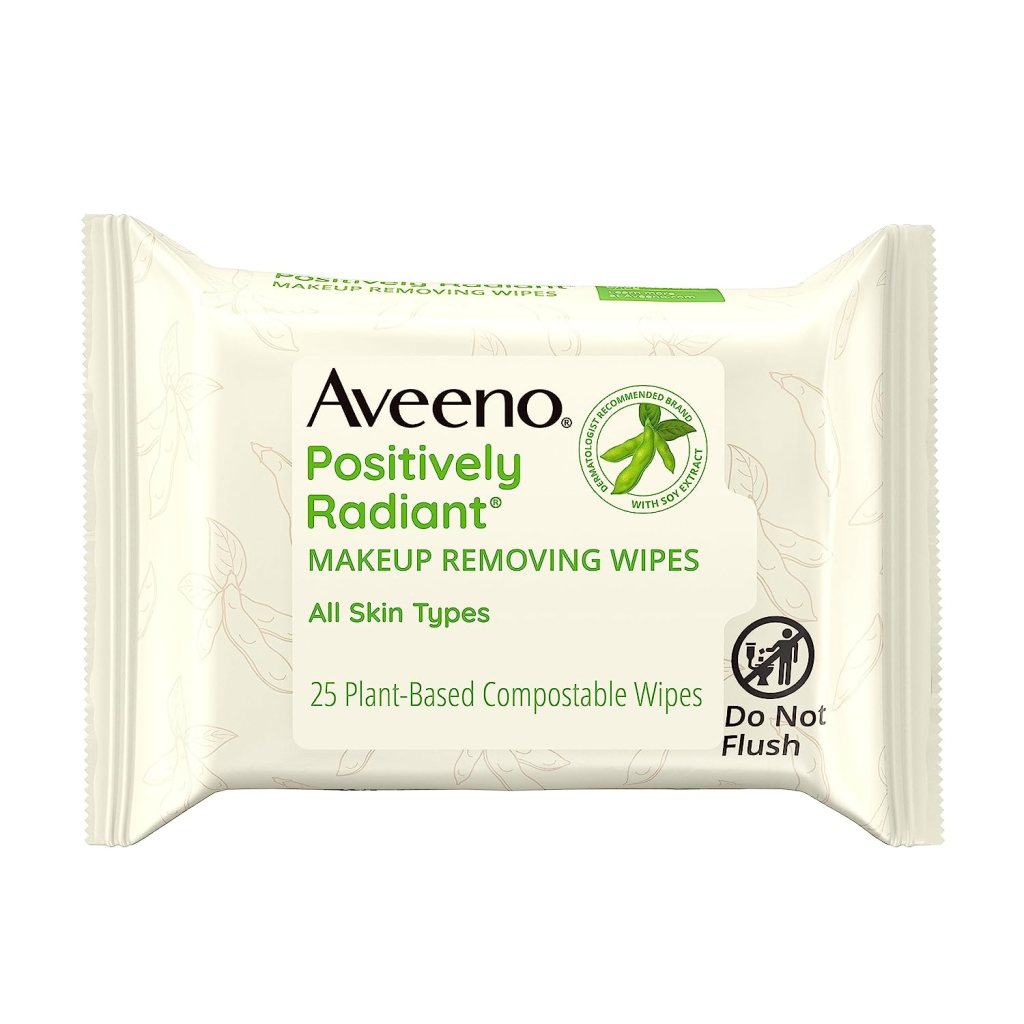 Aveeno Positively Radiant Oil-Free Makeup Removing Facial Cleansing Wipes contain moisture-rich soy extract to help even skin tone and texture. With 25 gentle and non-comedogenic wipes, they leave your skin refreshed.
