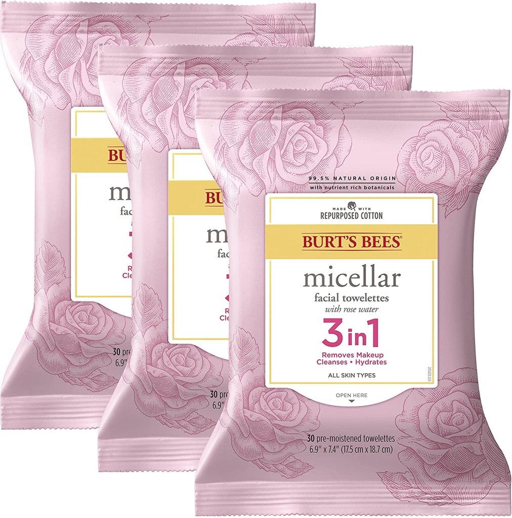 Burt’s Bees Face Wipes are 3-in-1 hydrating micellar cleanser towelettes suitable for all skin types. Infused with rose water, this pack of 30 wipes provides effective makeup removal and hydration.