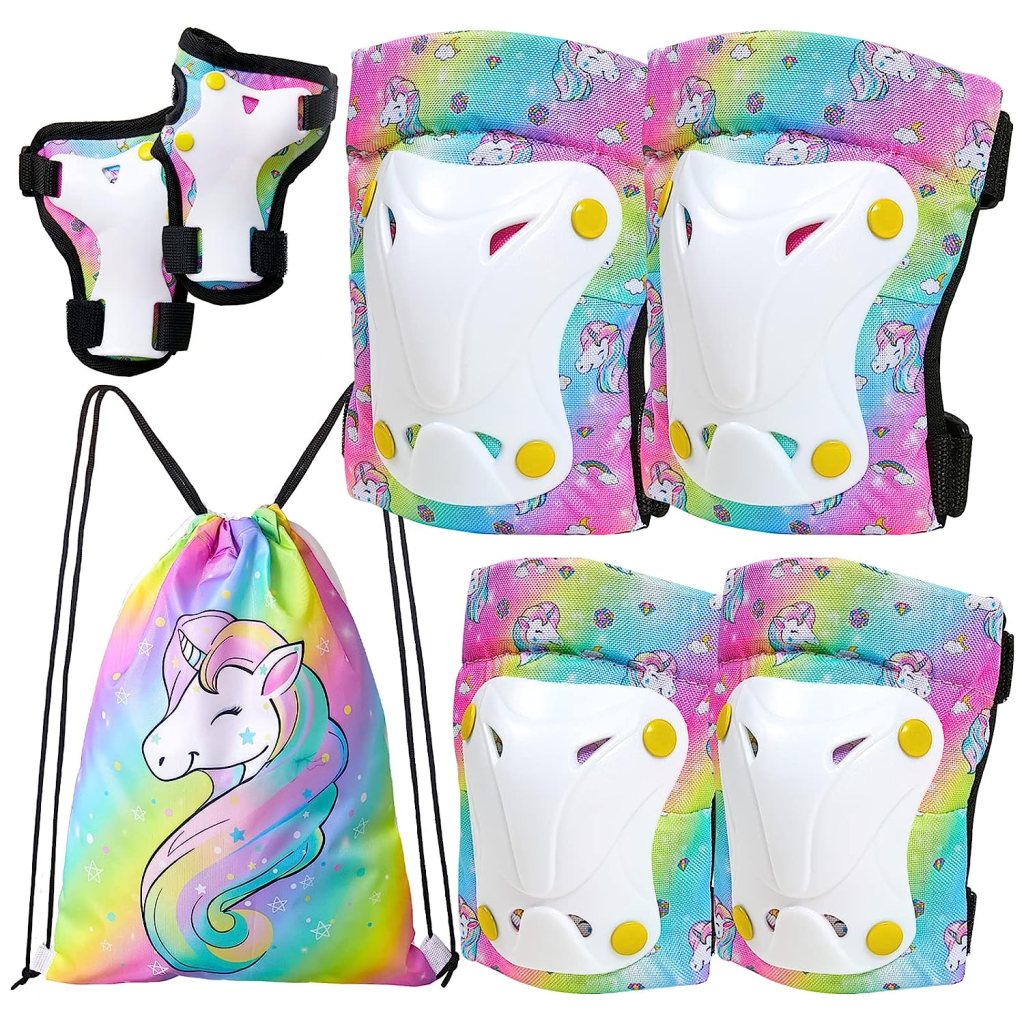 FIODAY Knee Pads for Kids Unicorn Knee Elbow Pads Wrist Guards with Drawstring Bag Adjustable Protective Gear Set for Girls Boys Inline Skating Bike Cycling Skateboard Scooter, 3-8 Years, Rainbow