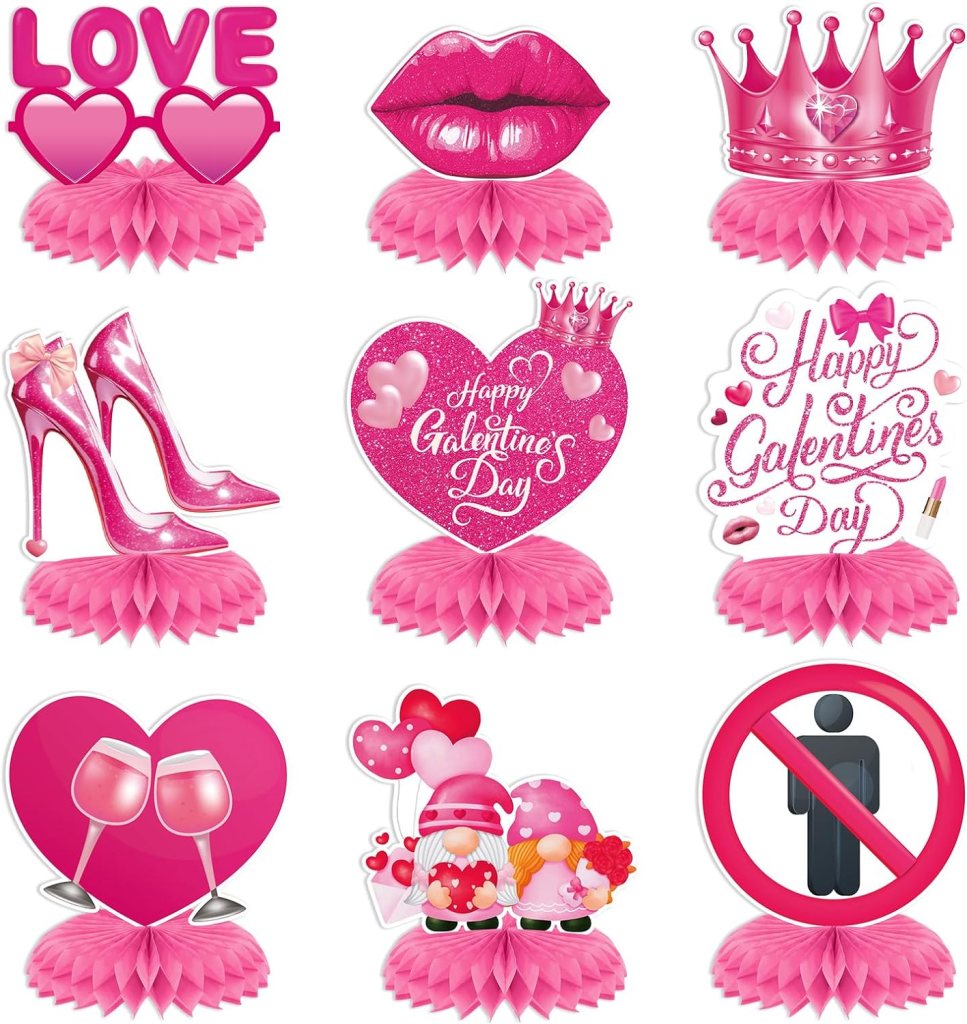 RoundFunny 9 Pcs Galentines Day Decorations Galentines Honeycomb Centerpieces 3D Happy Galentines Day Table Decor Honeycomb Centerpieces for Galentines Day Party Supplies Table Decorations
