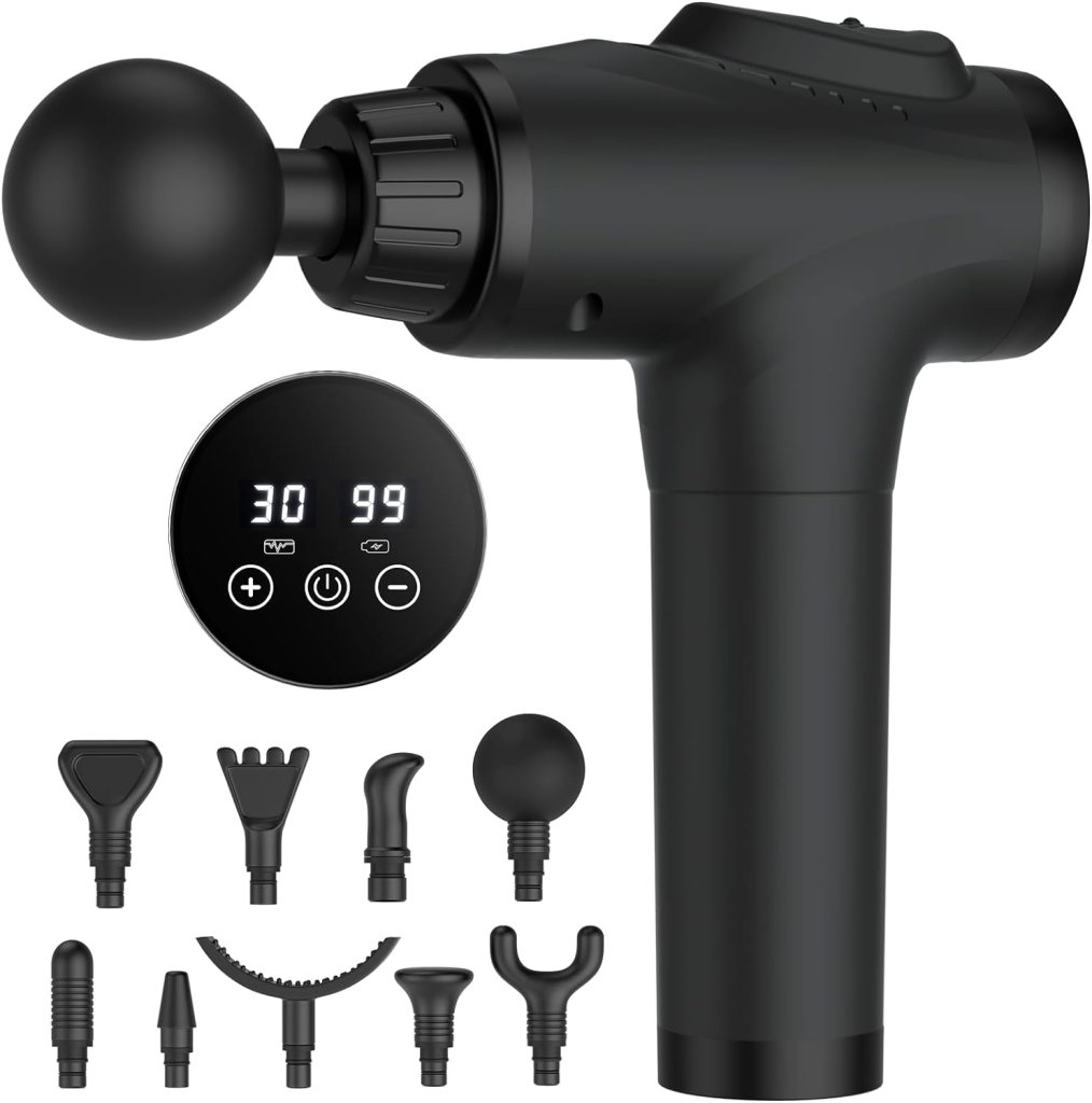 High-speed, deep tissue muscle massager with multiple speed levels and attachments.